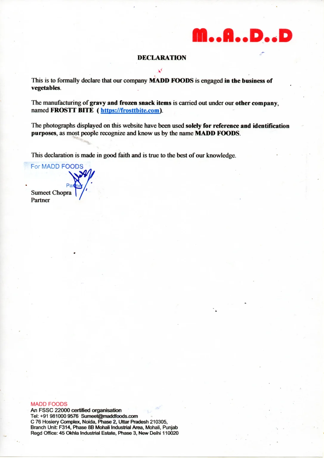 This is to formally declare that our company MADD FOODS is engaged in the business of vegetables.
